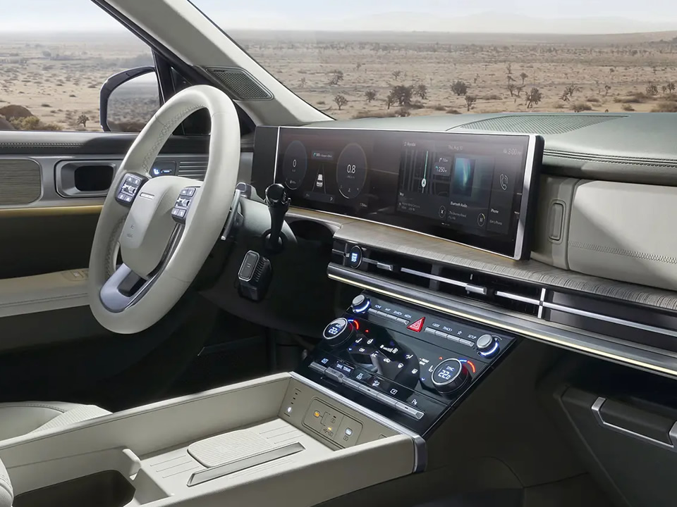 La pantalla curva panorámica de la Nueva Santa Fe se ha convertido en la primera de su clase. Esta pantalla envuelve con elegancia el panel de instrumentos de 12,3” y el sistema de información y entretenimiento de 12,3” para mejorar la visibilidad y ofrecer un acabado lujoso en la cabina.